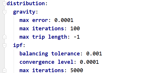 The distribution section of the parameter file is also fairly short, as it contains only the parameters for number of maximum iterations, convergence level and maximum trip length to be applied in Iterative Proportional Fitting and synthetic gravity models, as shown below.