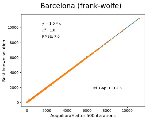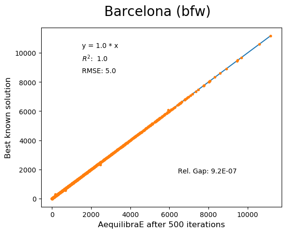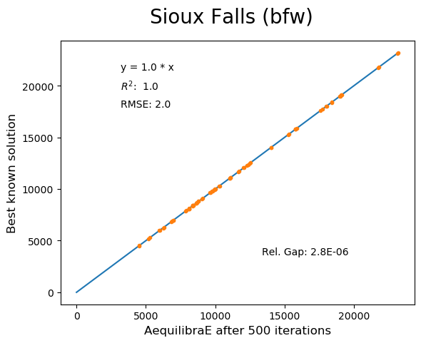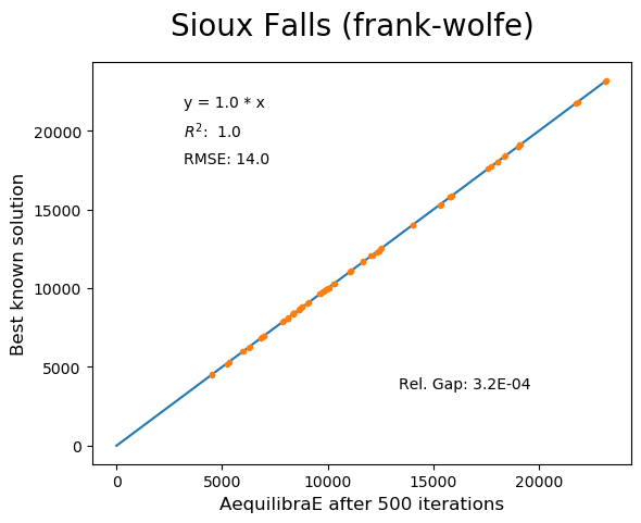 For this reason, we have used all equilibrium traffic assignment algorithms available in AequilibraE to solve standard instances used in academia for comparing algorithm results, some of which have are available with highly converged solutions (~1e-14): https://github.com/bstabler/TransportationNetworks/