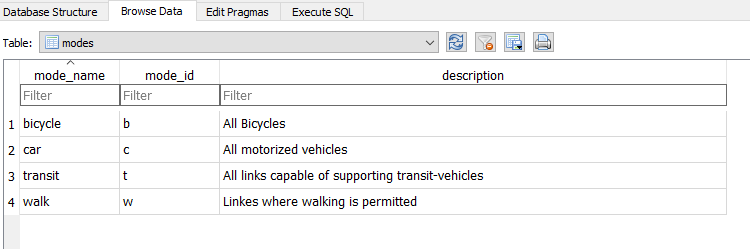 The modes table has five fields, being the mode_name, mode_id, description pce, vot, and ppv (persons per vehicle), where mode_id is a single letter that is used to codify mode permissions in the network, as further discussed in Network.