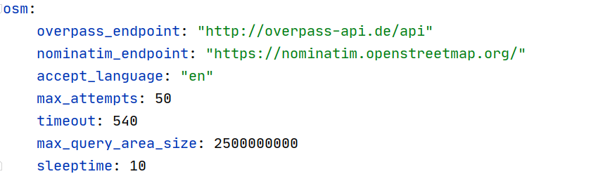 The OSM section of the parameter file is relevant only when one plans to download a substantial amount of data from an Overpass API, in which case it is recommended to deploy a local Overpass server.